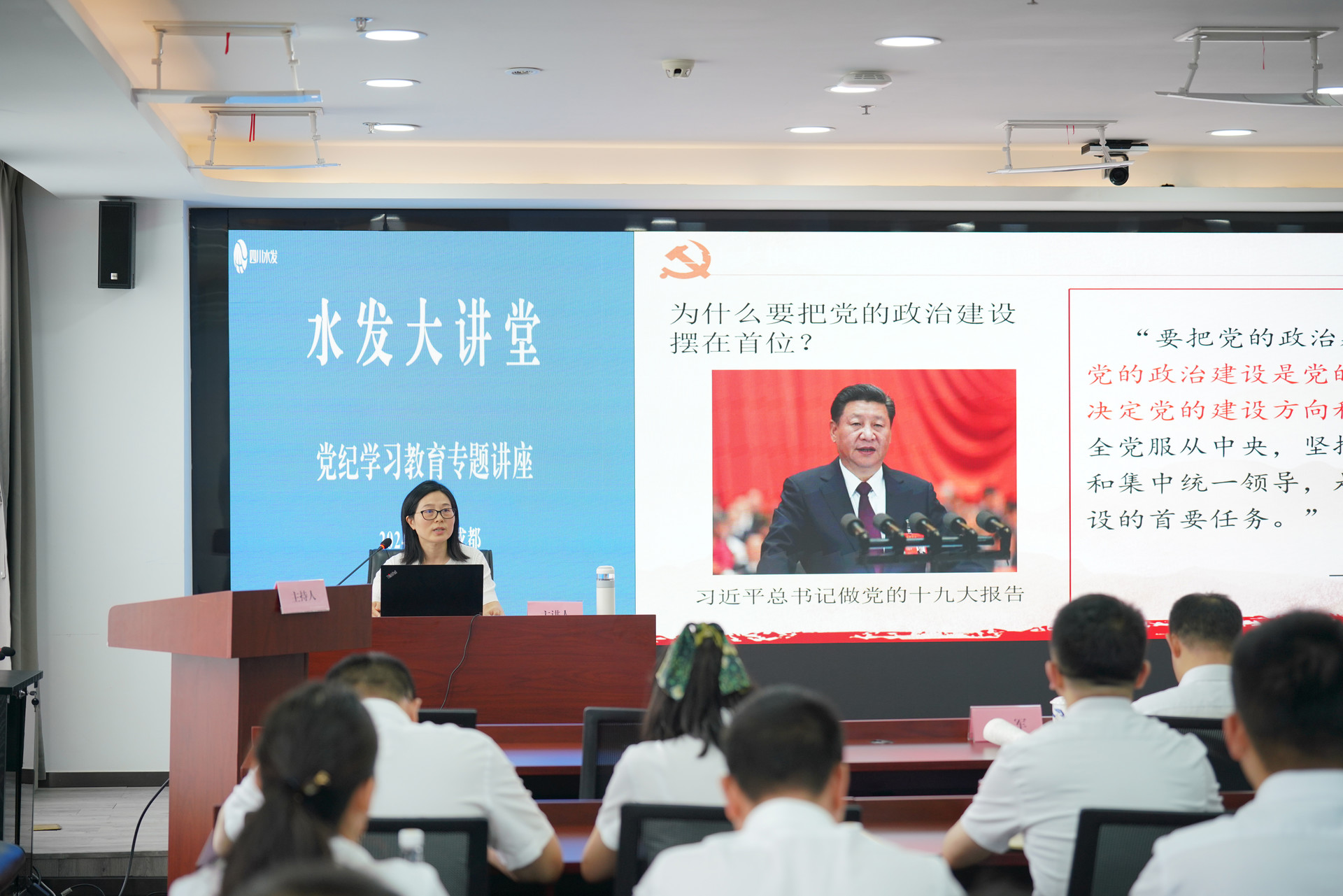 為深入學習貫徹新修訂的《中國共產黨紀律處分條例》,進一步強化黨紀法規意識,著力推進全面從嚴治黨,創新黨員干部理論學習的新載體、新路徑,5月17日,集團水發大講堂之“黨紀學習教育”第一期在集團總部開講。集團黨委副書記、董事、副總經理、總會計師尹曉東,集團黨委委員、紀委書記吳軍參加活動,集團總部、下屬企業黨員代表共計150余人通過線上、線下參加培訓。?